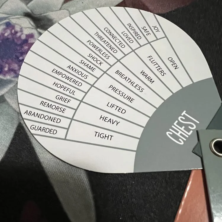 On the other hand, there are also times when I know exactly what emotion I’m feeling, but fail to connect it with my body. In this case, I can use the wheel in a bit of a backwards way — find the emotion on the outer part of the card, then do a little detective work and see if it corresponds to a sensation and where on the body it is. This backwards method doesn’t always work, but even so, it engages my thinking brain in a way that is not the norm for me. I also sometimes figure out what something is based off what it is not. It’s a useful experiment!